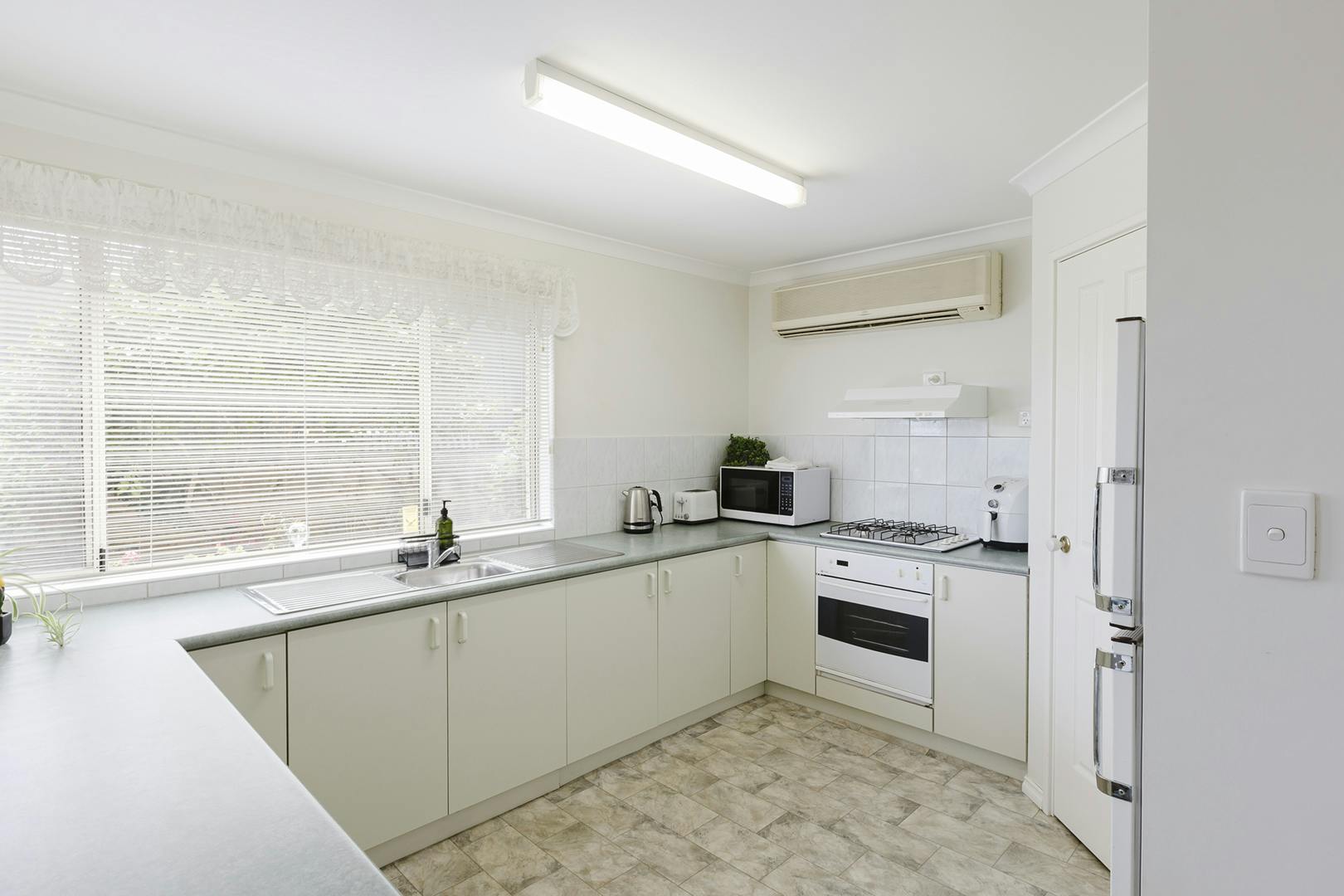 Several windows in the open living space make this a warm, welcoming room. At the front is the lounge flowing through to the dining area, then the kitchen with a corner pantry, gas cooking and ample workspace. A big air conditioner ensures year-round comfort.