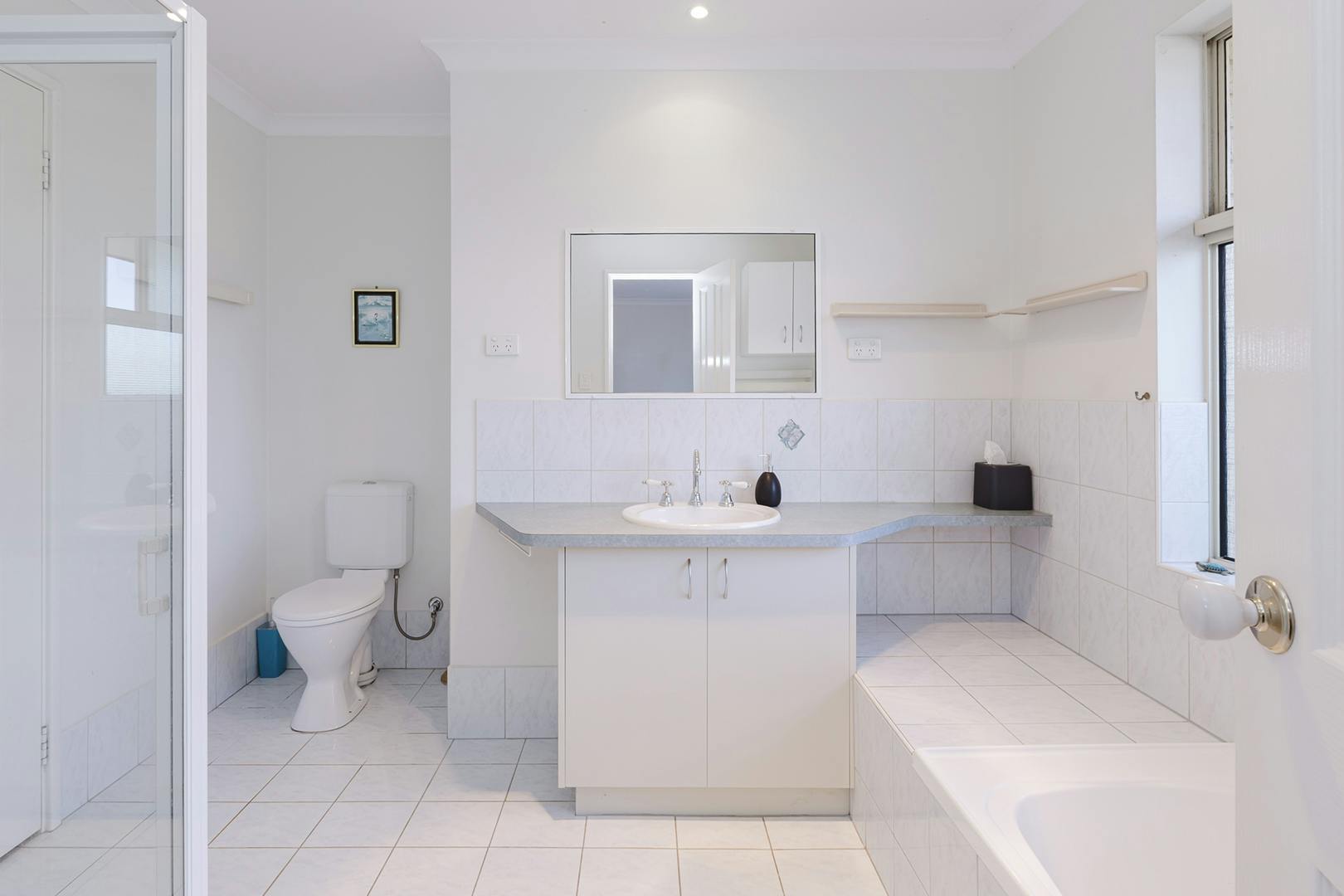 This room accesses the semi-en suite bathroom complete with bath, walk-in shower, vanity and toilet.