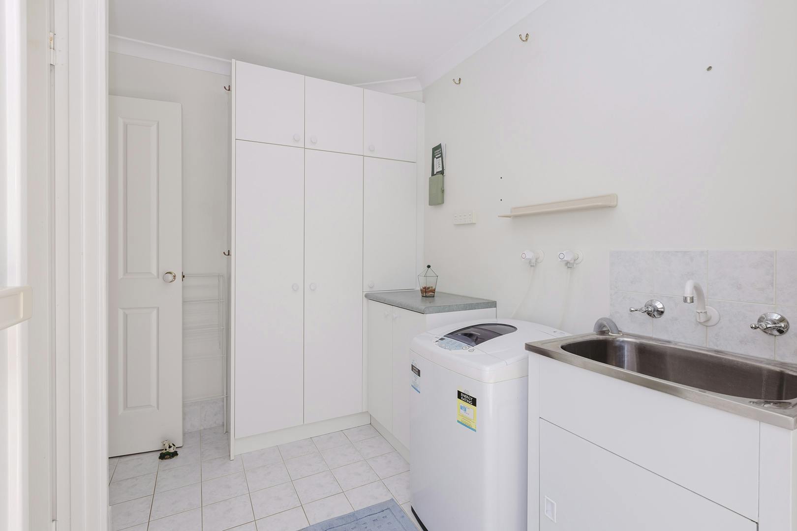 Further down the hall is a sizeable linen press, then the laundry, with stacks of cupboards and a second toilet.